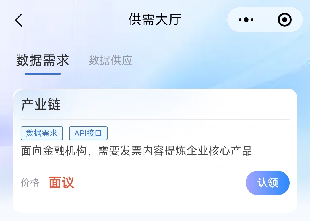 将复杂的数据交易业务简化为清晰的移动端操作。用户可以随时浏览不同应用领域的各类数据产品,在供需大厅自由发布或认领需求。新增的数据产品收藏功能,支持小程序与网页端同步展示,大幅缩短用户购买路径。